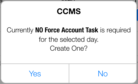 - If the user is not the Force Account’s Primary Inspector the following message will appear. Tap Yes to CCMS No Force Account Task message to start a new force account task.
