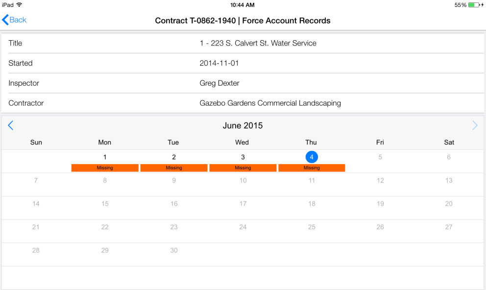 - Tap the date to start a Force Account Record using Calendar. The calendar will display the status of the Force Account Record for each day since the Force Account was started. If you are not the primary inspector you will not see a status for the date, however you can enter a force account record if needed.