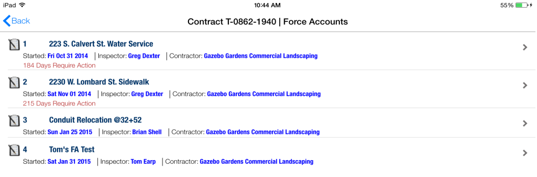 - Select the contract to determine if any Force Accounts are available. Force Accounts are entered by the RE in the CPOM application and synced to the tablet.
