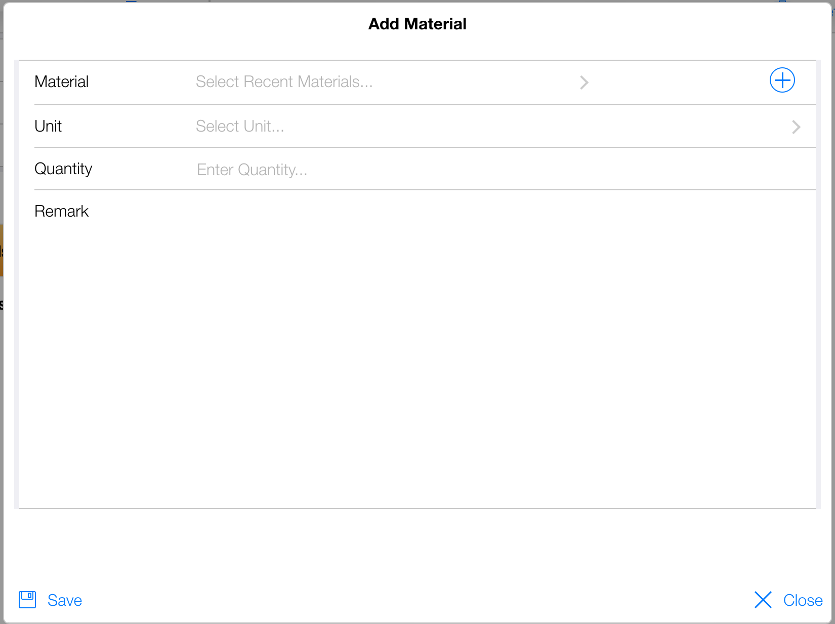 button.- Select the Unit (Note: If you select a Recent Material the Unit will be automatically populated).