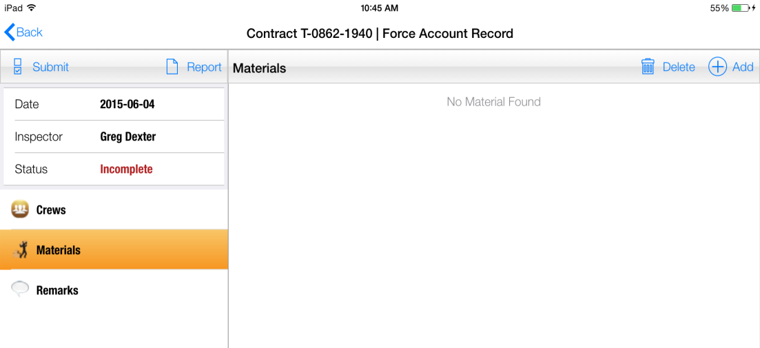 Materials used for work related to the Force Account should be logged in the Force Account Record for the day. Follow the steps below to Add, Edit, and Delete Materials.