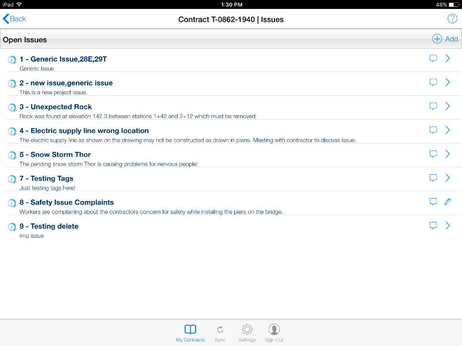Issues can be created and managed during the life of Contract/Project. An issue can be added by the Inspector on the tablet or by the OE/RE using the CPOM Web Application.