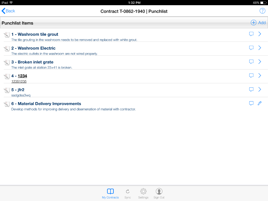 Punch List Items can be used to track additional tasks associated with the Contract/Project. Punch List Items can be added by the Inspector on the tablet or by the OE/RE using the CPOM Web Application.
