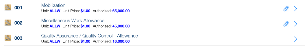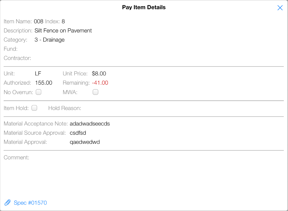 - Pay Items with attached Specifications will display an attachment link in the item line. You can tap the link to download and view the Specification