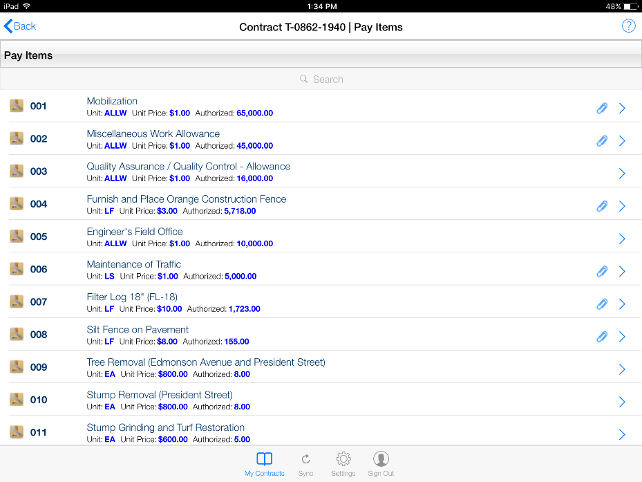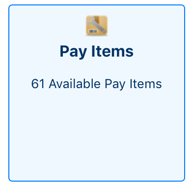 Pay Items for each Contract or Task Order can be viewed through the Pay Items page. The Pay Items are added in CPOM at the beginning of the contract and downloaded to your device through the Sync.
