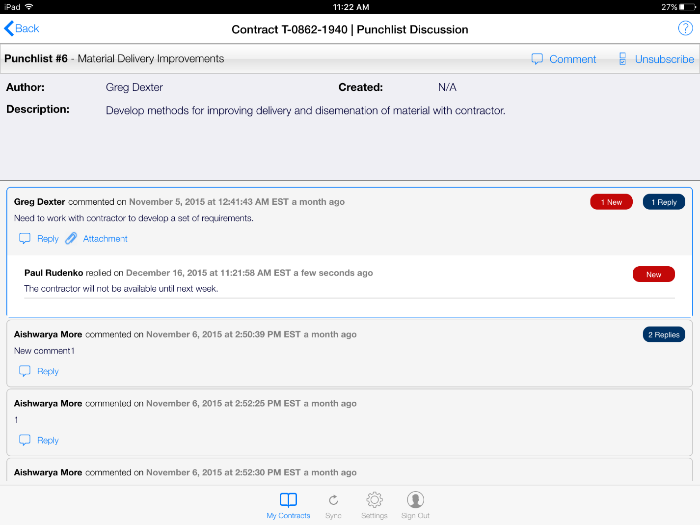A red badge on the Contracts Main Menu indicates a new comment or reply.