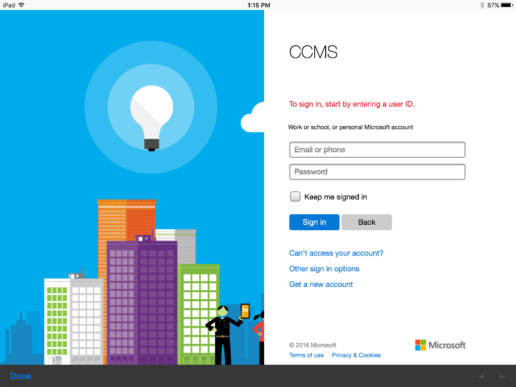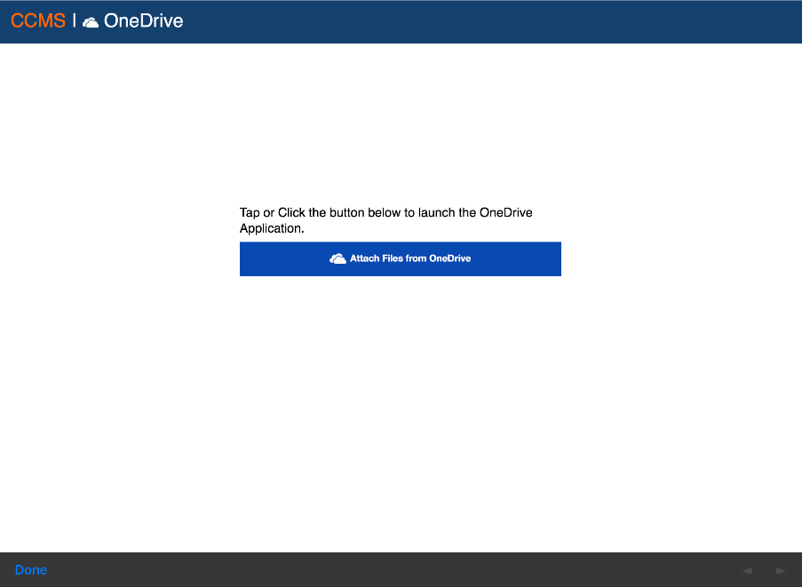- You will be required to login to your OneDrive account. Please note this is typically not your CCMS login. The OneDrive system is a separate, Cloud Based, Document Management system. CCMS simply provides an interface to this system. We recommend creating your Microsoft Account prior to using the CCMS OneDrive module.