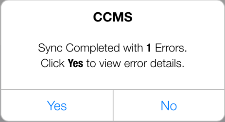 The following CCMS Sync Error message is displayed when there are Sync errors:
