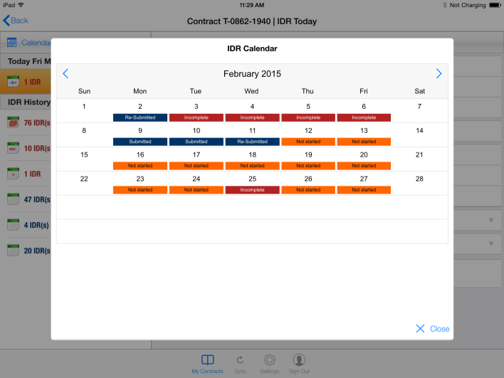 The calendar view option is accessed by tapping the Calendar button located in the upper left corner of the IDR Today page. Upon selection, a pop up calendar will display showing the IDR Status code for every work day.