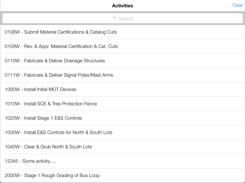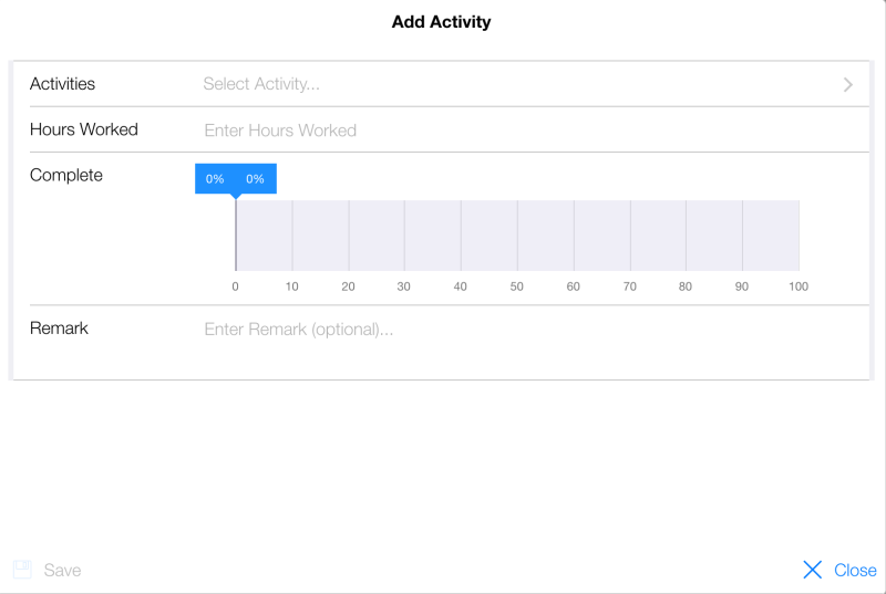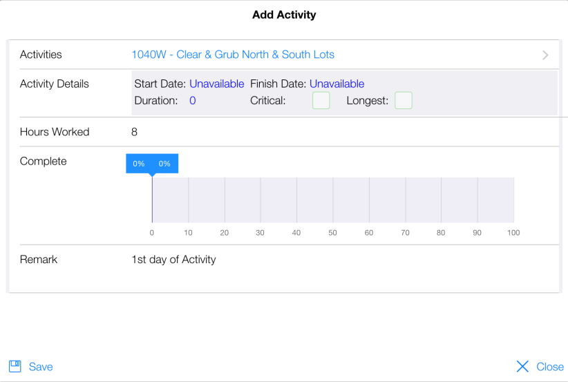 - In Add Activity form, tap the Activities field to access drop down list of project Activities to select