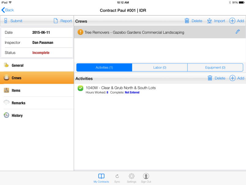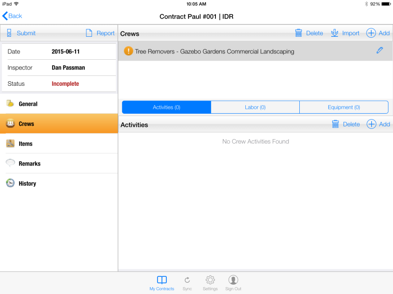 NOTE: Only Activities that currently exist in the contract database can be added to a Crew record. If a new Activity is necessary, it must be added using the CPOM module. There is currently no method to add an Activity using the tablet. Contact the OE for any new Activities.