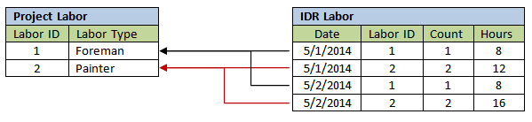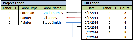 Using the example above, the following diagram illustrates the relationship between Project Labor and IDR Labor records for the Basic Mode:
