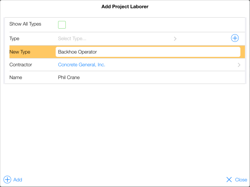 - In Add Project Laborer form, tap the (+) icon located on the Type line