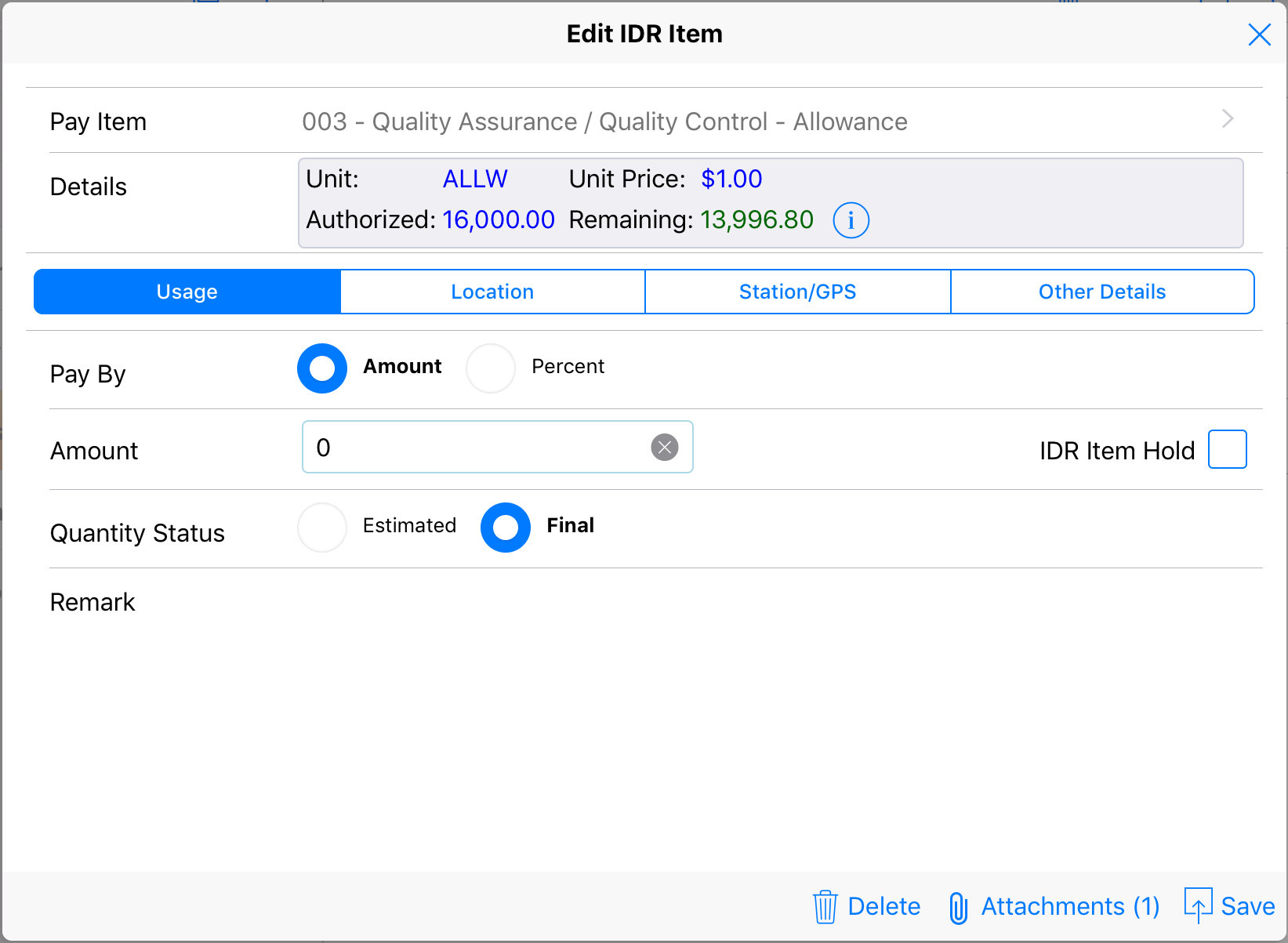 - Pay By: This option is available in the contract/project has been configured to accept percentage based quantities. By default, only quantities can be entered.