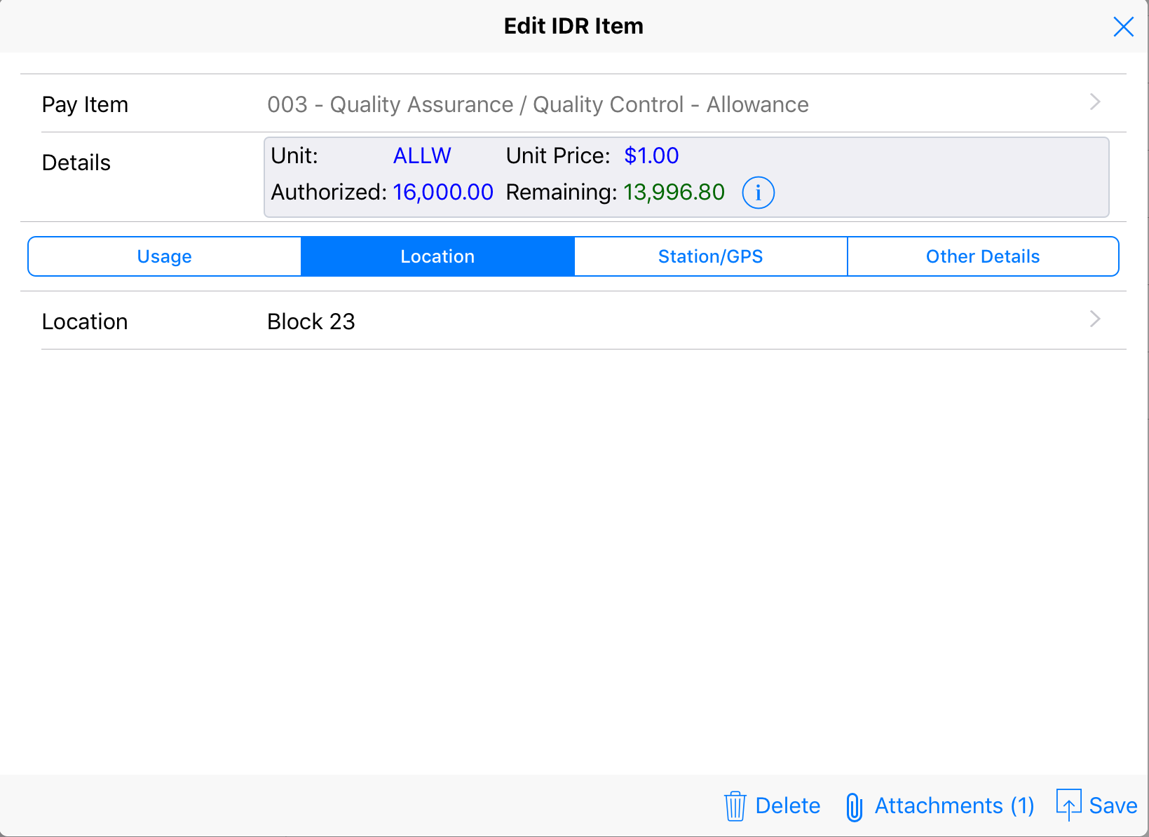 - Capture: Tap this button to capture/save the location marker data for the IDR item. (The GPS fields will be filled).