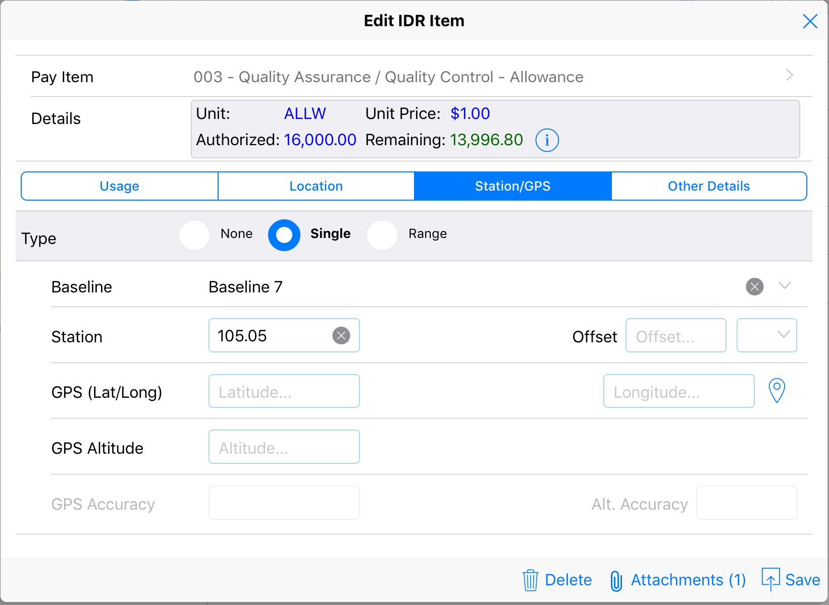 - Station/GPS - This tab allows you to enter data related to Baseline Stationing and GPS. (None/Single/Range