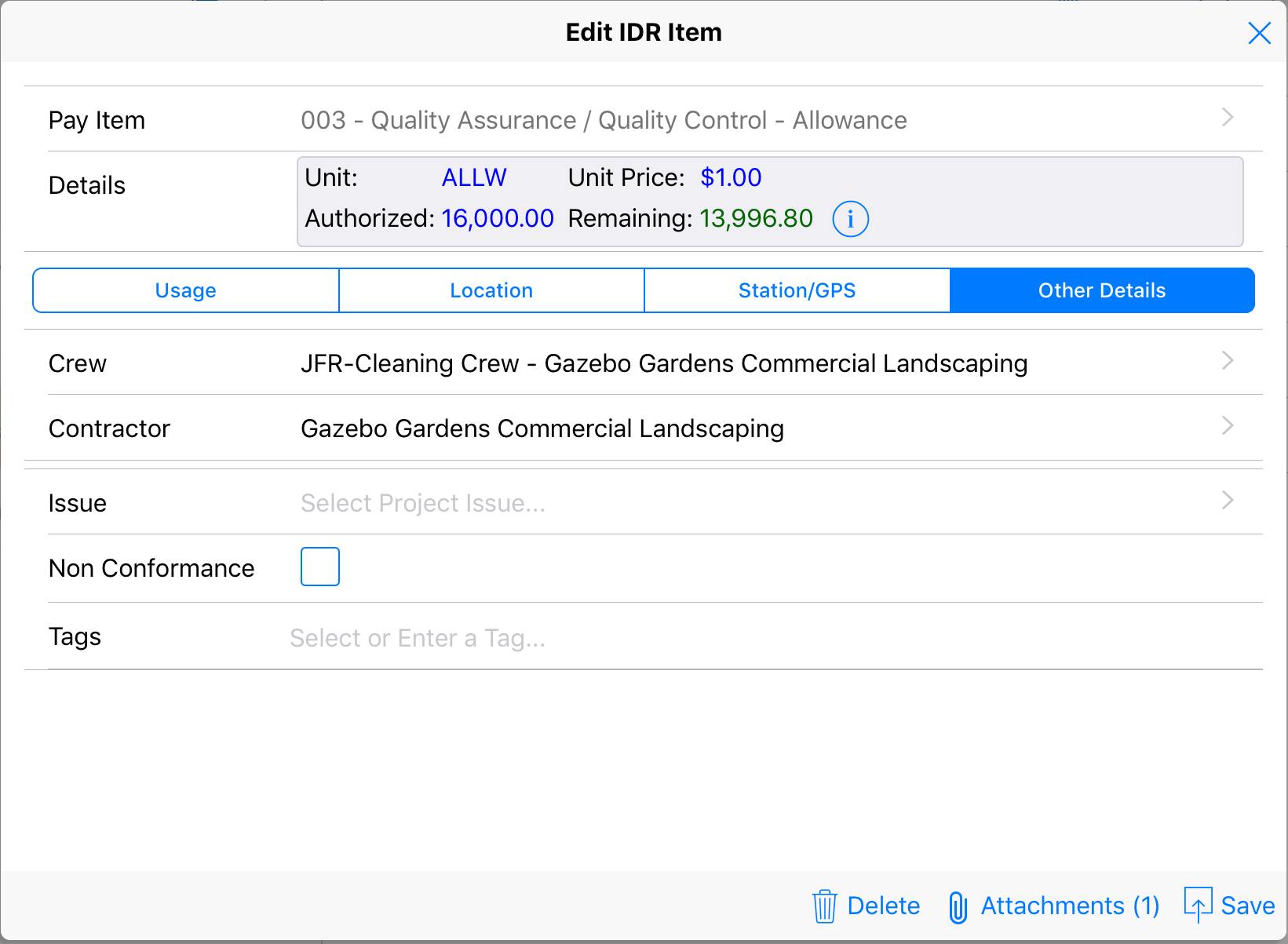 - Other Details - This tab allows you to enter optional data points for the IDR Item.